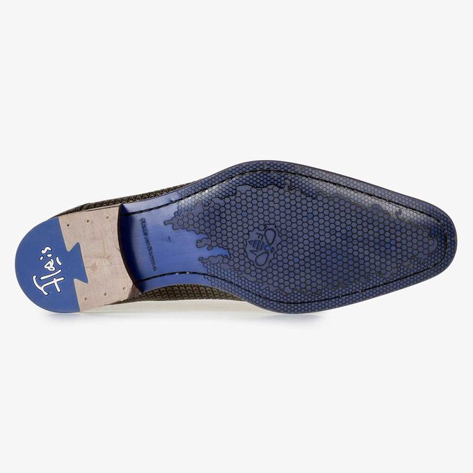 Das bronzefarbene Kalbsleder mit Metallic-Print macht diesen Schnürschuh zu einem absoluten Blickfang. Die kobaltblaue Sohle, die mit einem Wortspiel von Floris versehen wurde, sorgt dabei noch für einen zusätzlichen „Überraschungseffekt“.