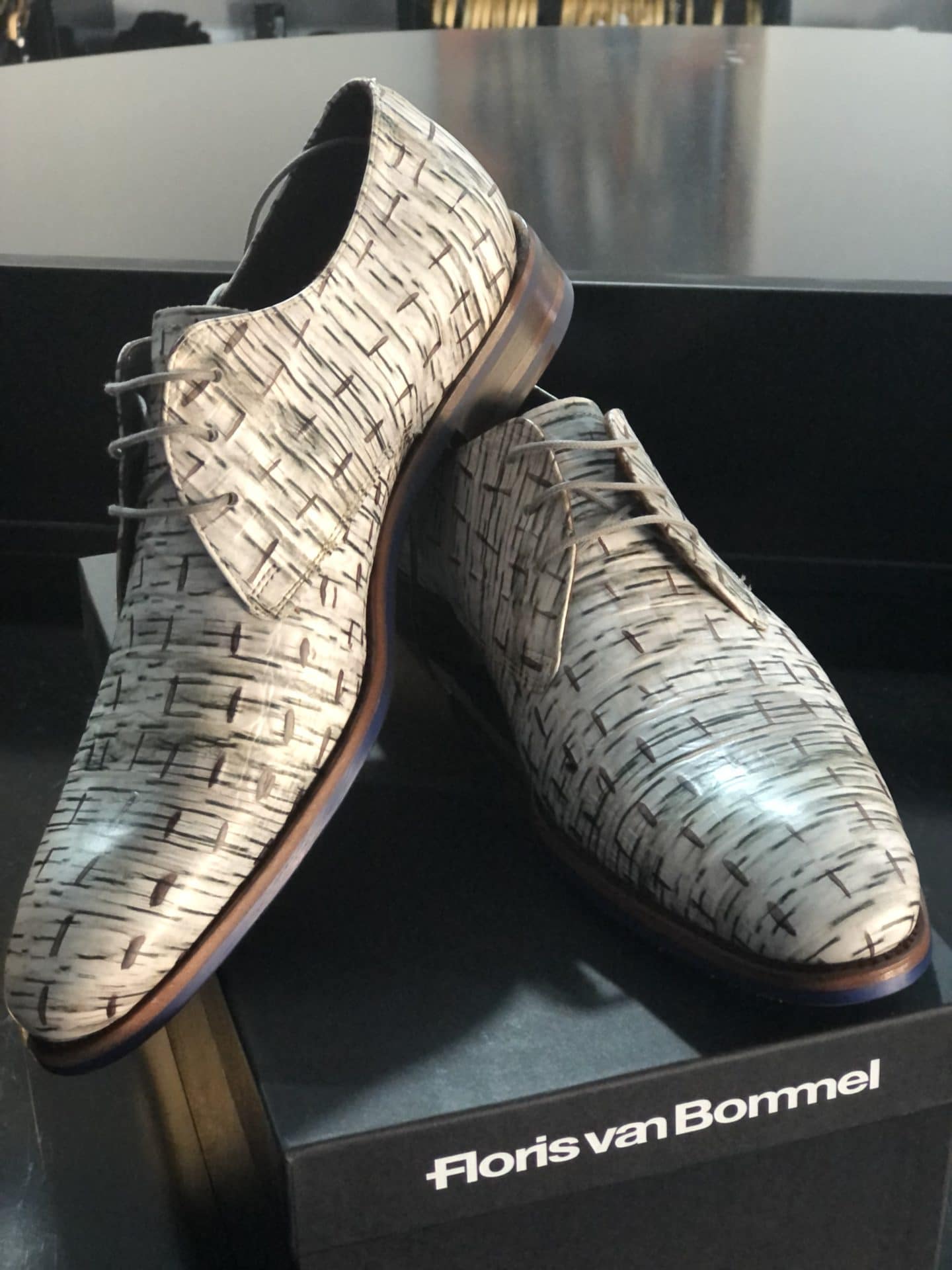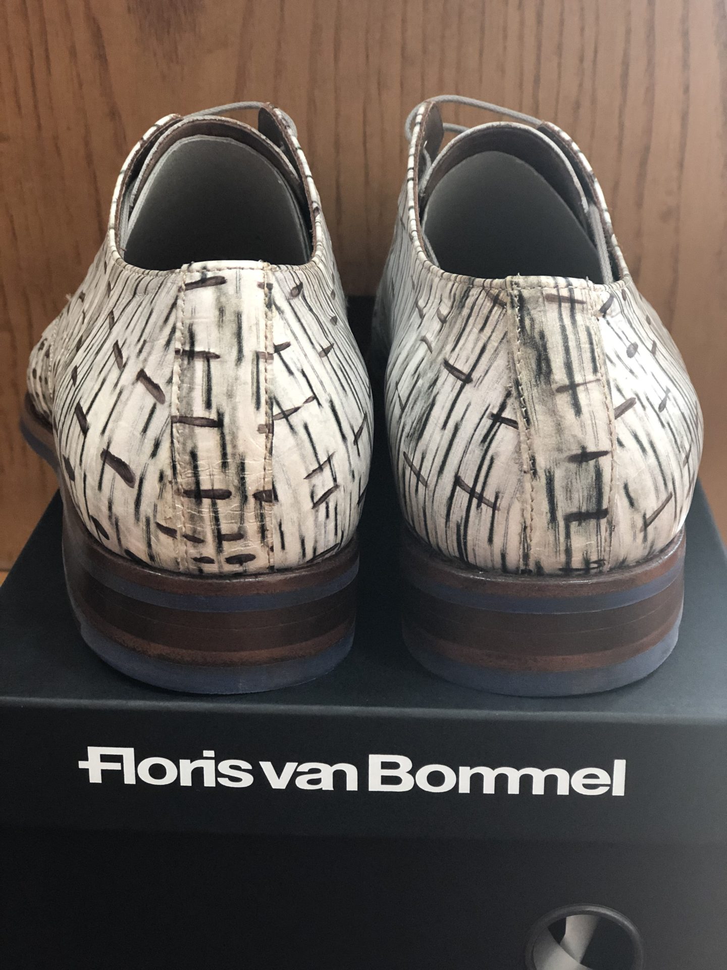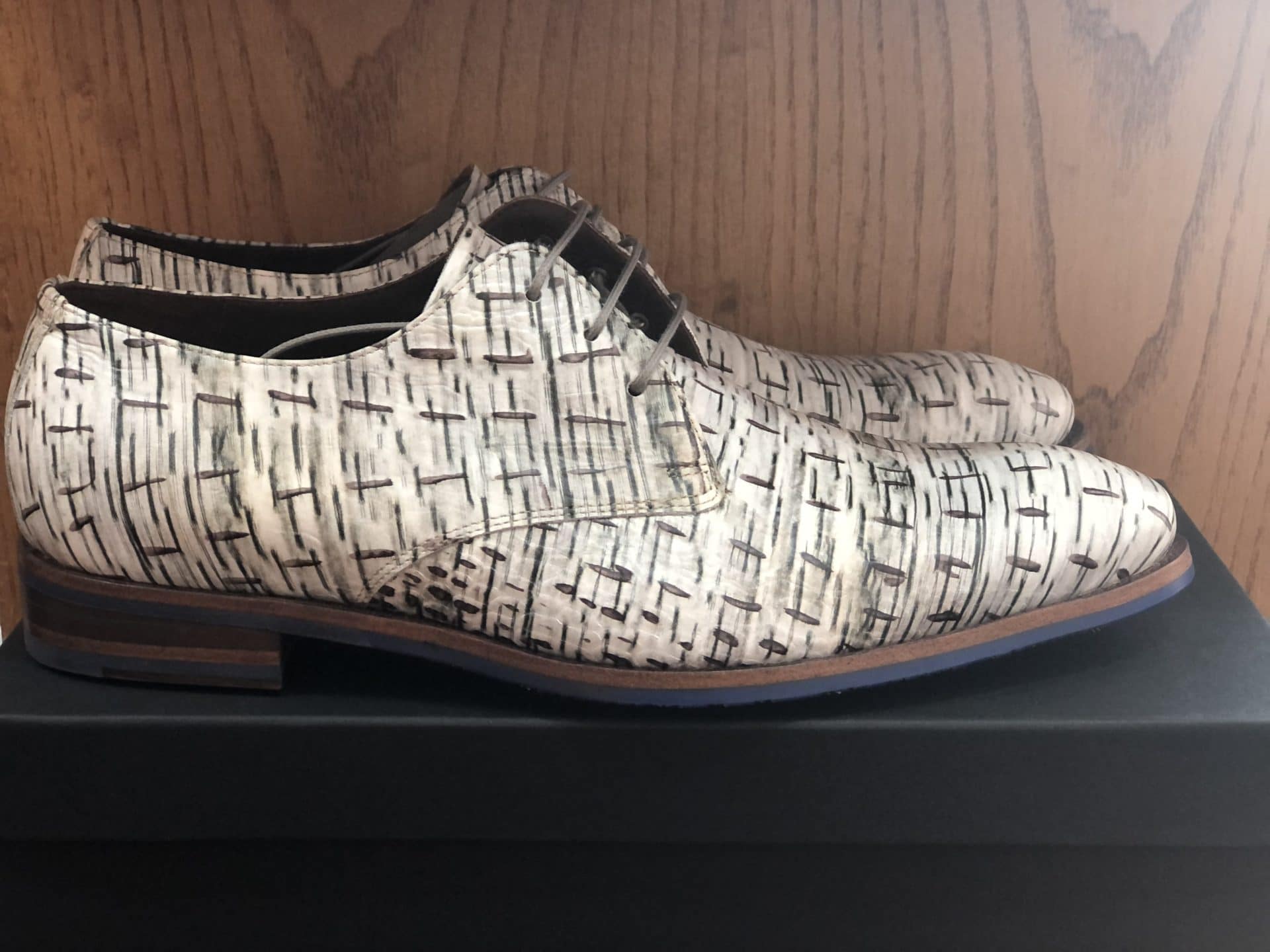 Die Kombination aus verschiedenen Farben und Materialien macht diesen Schnürschuh zu einem ganz besonderen Modell. Der Schuh ist aus offwhite`m Leder in CROCO PRÄGUNG und mit einem Blauen Print an der Sohle versehen.