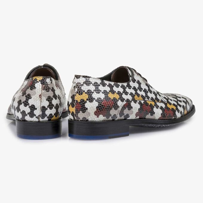Dieser elegante Derby aus weißem Kalbsleder mit mehrfarbigem Puzzle-Print ist mit einer schwarzen Gummisohle und einem weißen All-Over-Schuhprint versehen.