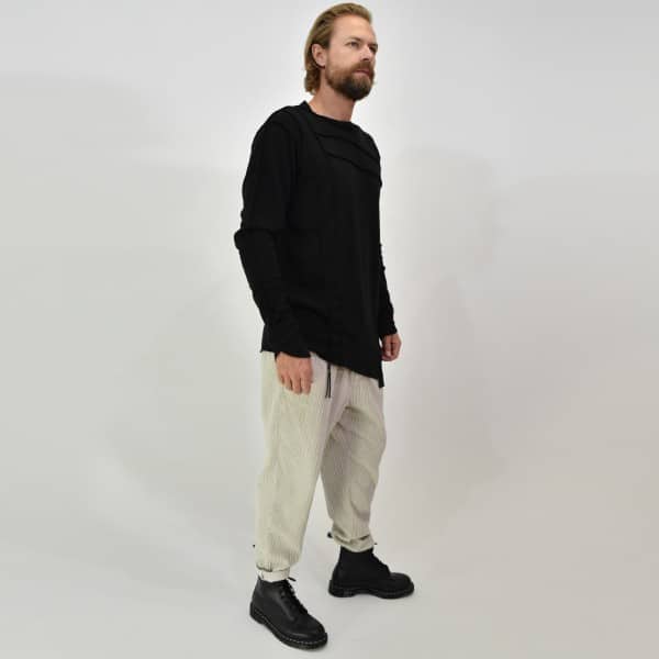The Maglia sweater is a sweater with a long sleeves that embraces the body and has an asymmetrical shape. The front is decorated with weave details that give it a unique style. The characteristic touch of La Haine with a strap on which La Haine’s Logo is visible appears on the back.